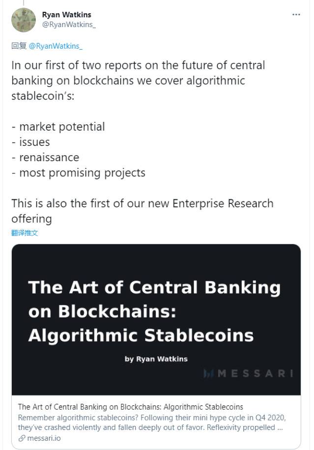 2. 在 Messari 关于区块链中央银行未来的两份研究报告中,第一份覆盖了算法稳定币内容: