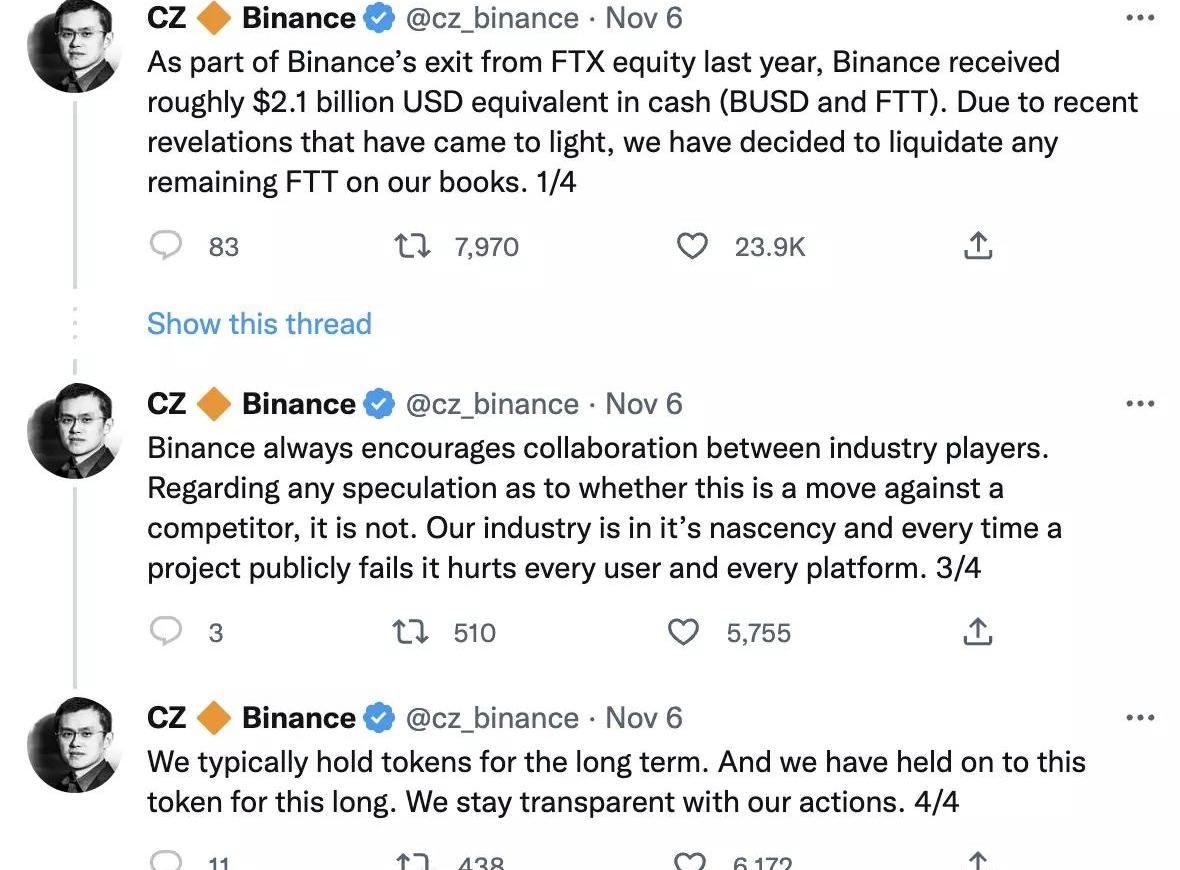 ishighrisk」之后,Binance创始人CZ在Twitter表明了Binance关于FTT的投资态度:Binance在去年推出FTX股权投资时大约21亿美元的等值现金。由于最近曝光的情况,Binance决定清算账面上任何剩余的FTT。