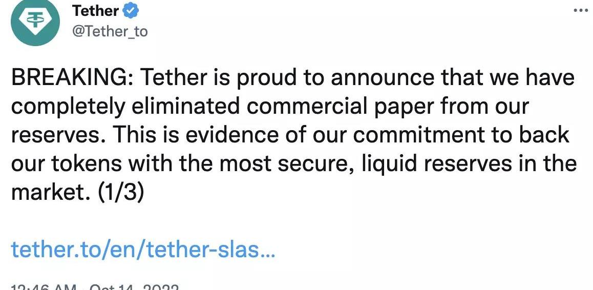 10月14日,Tether宣布完全消除了储备中商业票据的份额。