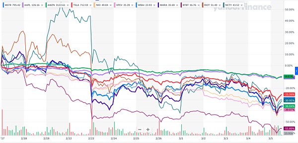进入三月以来的短短几天,美股市场持续低迷走势,而实际上这种下跌趋势对于一些股票来讲,已经持续了将近一个月。截止发文,在过去一个月,在疫情期间领跑的科技股Apple(APPL: -12%)和Amazon(AMZN: -12%)股价大幅走低,而对于波动更大的新能源汽车板块,似乎更是处于“泡沫”破碎的边缘,特斯拉在过去一个月股价下降了30%,中概股蔚来(NIO: -35%),小鹏(XPEV: -44%)和理想(Li: -31%)也都大幅下跌。但由于近期加密市场的集体下行,比特币以太坊从高点坠落,一些“比特币概念股”和“区块链概念股”的跌幅更大。价值投资比特币的龙头公司MicroStrategy?(MSTR) 的股价自最高点下跌了50%,数字货币挖矿公司如500.com(WBAI:-68%),Marathon Patent Group (MARA: -37%),Riot Blockchain(RIOT: -47%),Bit Digital(BTBT: -56%),以及第九城市(NCTY: -50%)等上市公司股价也都自最高点断崖式下跌。