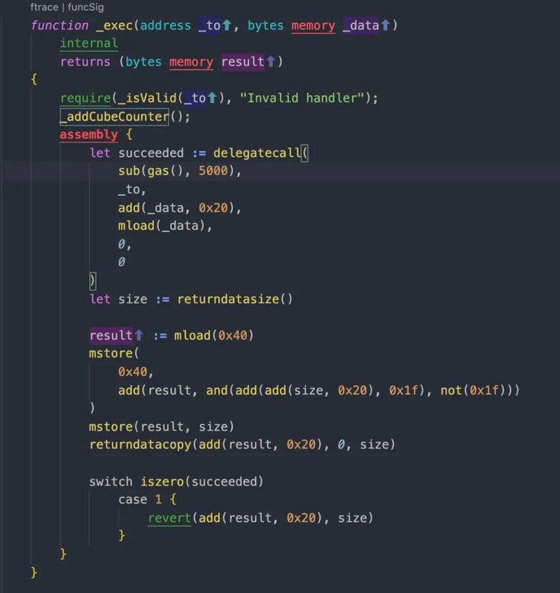这里有一个 trick,由于 0 地址是一个 EOA 地址,所有对 EOA 地址的函数调用都会成功,但是不会返回任何结果。结合这个 trick,execs 函数中的关于 configs 数据的部分可以先暂时忽略。直接看到最后的核心 _exec 函数: