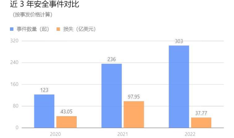 根据慢雾区块链被黑事件档案库统计,2022年安全事件共303件,损失高达37.77亿美元。