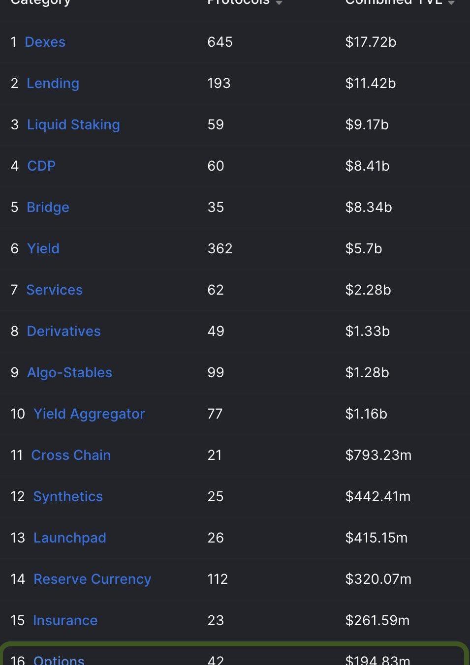 截至今天,DefiLlama显示期权TVL仅仅只有1.94亿美元。