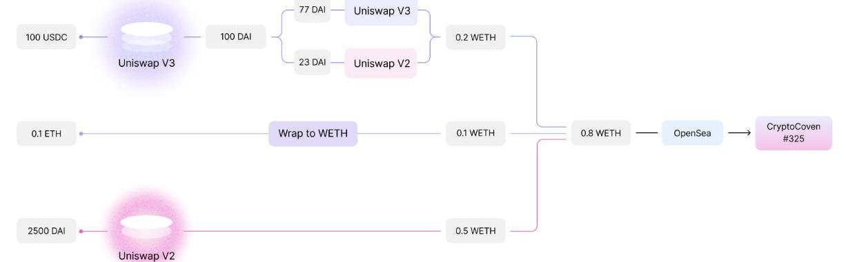 Permit2和UniversalRouter结合后,用户可以在UniswapV2和V3上单笔交易执行多个代币交易的行为,并在一次交易中从多个市场购买NFT。比如使用交易路由在UniswapV2和V3上执行ETH交易为WETH,并在OpenSea上购买某个NFT,整个流程可以作为一次交易执行完毕。