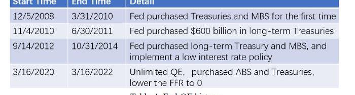 与传统的利率调节不同,QE指的是央行将货币政策关注点从控制资金成本转向控制资金数量,目标是通过向市场注入资金使得金融体系维持在流动性宽松的环境下。QE的一般方式是央行在压低基准利率的同时,通过购买国债和企业债券的方式,压低长期利率水平,并且保持市场流动性宽裕。这一货币政策工具最早在2001年由日本央行提出,并且在2008年金融危机时由美联储采用而世界闻名。从2008年至今,美国采用的QE政策情况如下表: