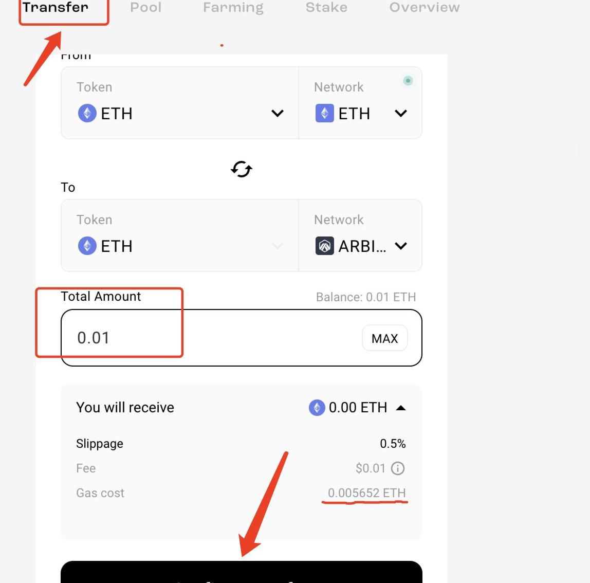 点击上方菜单栏的“Transfer”,输入转账数量,在这里我们转账0.01e就好,选择跨链到Arb,顺便交互下Arb.(手续费要0.005e,还是挺贵的),点击“Comfirmtransfer”,钱包确认交易。