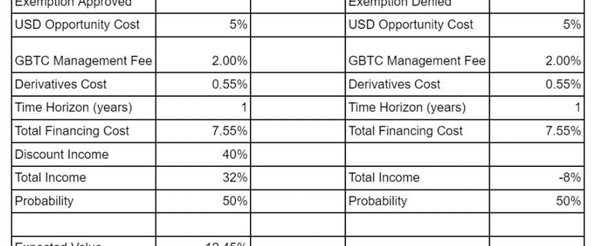如果我们保守一点,假设需要两年时间才能实现可接受的退出,那么上表列出了这笔交易的成本。收入是GBTC在市场上的40%的折扣,或者你的执行水平是多少。在目前的水平上,这笔交易有25%的收益。