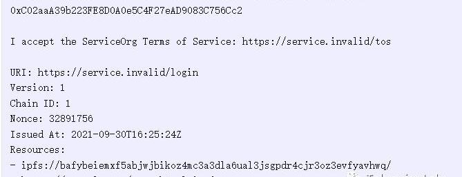 该钱包为用户提供了一个结构化的明文消息或等效的接口,用于使用EIP-191签名数据格式进行签名。在签名之前,消息前缀是EIP-191中定义的为x19EthereumSignedMessage:n<lengthofmessage>。该消息必须包含以太坊地址、请求签名的域、消息的版本、链标识符chain-id、用于范围的uri、依赖方可接受的nonce和发出的时间戳。然后将签名提交给依赖方,由依赖方检查签名的有效性和消息内容。其他字段,包括过期时间、not-before、请求id、语句和资源,可以被合并为登录过程的一部分。依赖方可以进一步获取与以太坊地址相关的数据,例如来自以太坊区块链(例如,ENS,账户余额,EIP-20/EIP-721/EIP-1155资产所有权),或其他可能或可能不被允许的数据源。事例消息