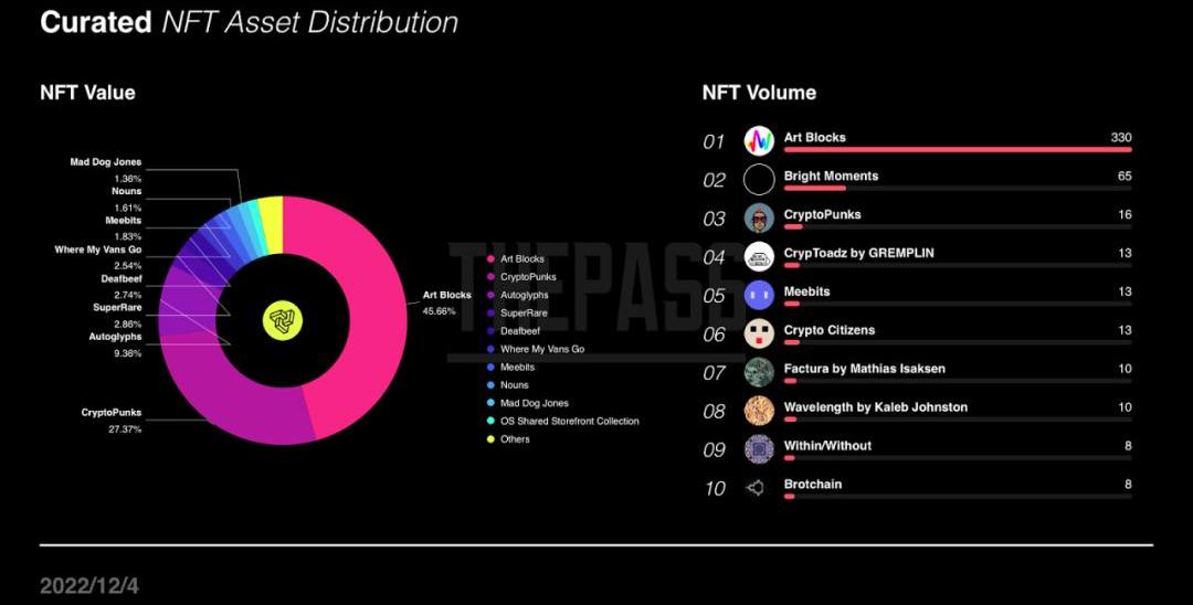 Curated是由ToddGoldberg和AndrewJiang成立的3000万美金的NFT加密基金。这支加密基金只用于投资NFT,他背后的支持方包括AndreessenHorowitz的MarcAndreessen和ChrisDixon,以及Reddit和SevenSixVentures创始人AlexisOhanian,以及ElectricCapital、Pantera和LatticeCapital的代表。从thepass.to数据可知,Curated收藏体量最大为ArtBlocks,占据41%,其他依次为CryptoPunks,Autoglyphs,SuperRare,Deafbeef和WhereMyVansGo。