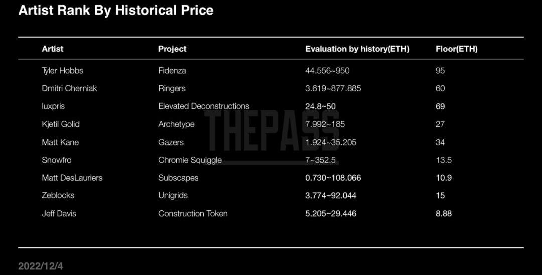 从资产价格评估角度,Curated系列艺术家按照系列地板价排名,前十分别为(2022/12/4):TylerHobbs,luxpris,DmitriCherniak,MattKane,KjetilGolid,Zeblocks,Snowfro,HarveyRayner|patterndotco,MattDesLauriers和DanielCalderonArenas。