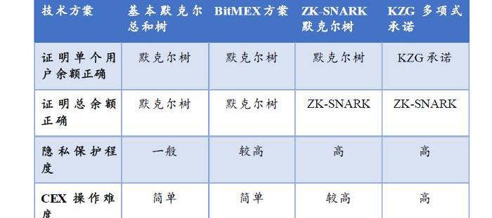 这里先对基本默克尔总和树、BitMEX方案、ZK-SNARK默克尔树、KZG多项式承诺做出总结和比较,如下表所示。前两种方法操作简单,尽管有隐私暴露的风险,但在目前看来没有重大隐患,已经足够应用在实际中。后两种方法中要使用ZK-SNARK证明加法计算,这会给交易所带来额外的操作,所以增加了操作的成本。KZG多项式承诺的方法更高级,但是交易所计算承诺的过程资源消耗大,涉及大量椭圆曲线点运算,所以可能暂时还不会获得采用。以上所有方法用户都不需要有搜索操作,且都容易验证。