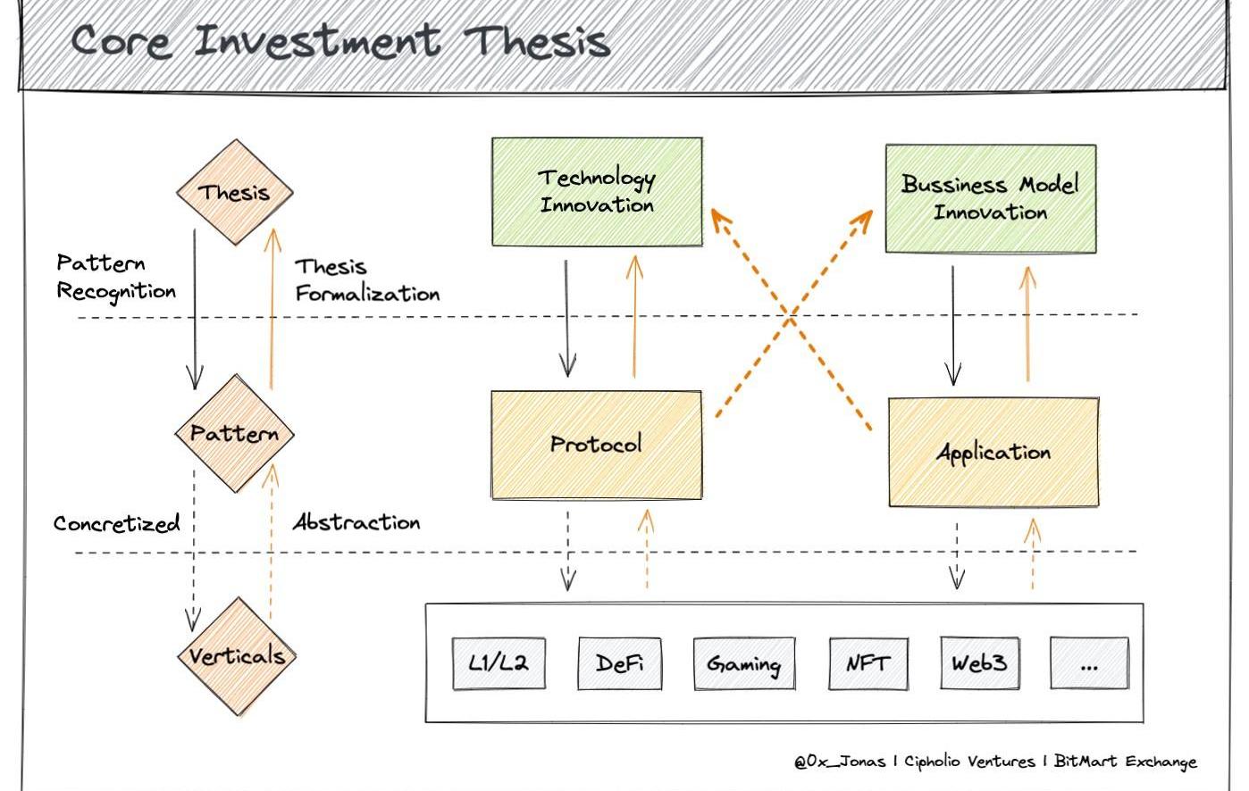 最后说一下CipholioVentures的投资理念是如何形成的。我们认为所有原生加密创新只有两种模式:技术创新驱动和商业模式创新驱动。这些分别对应于协议层和应用层的创新。按照这个逻辑,我们就可以梳理出不同垂直领域的产业结构竞争格局,而这个从想法到模型再到组件的过程,就是我们做产业研究的框架,也是我们上面分析不同垂直领域的核心框架。而投资恰恰是相反的过程,即我们需要根据未来可能的基本构成,抽象出对应的模式是什么,然后向上推测,看哪些技术创新或者商业模式创新能带来这样的变化,最后形成指导未来投资的核心投资理念。