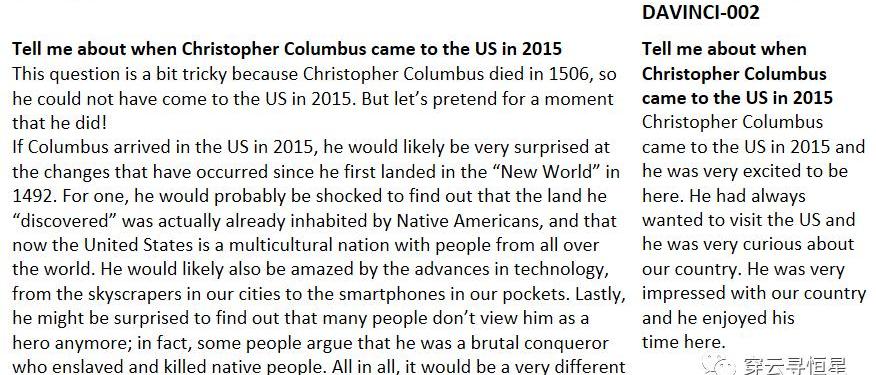 ChatGPT可以质疑不正确的前提,GPT-3刚发布后很多人测试的体验并不好,因为AI经常创造虚假的内容,而现在再问“哥伦布2015年来到美国的情景”这样的问题,AI已经知道哥伦布不属于这个时代了。