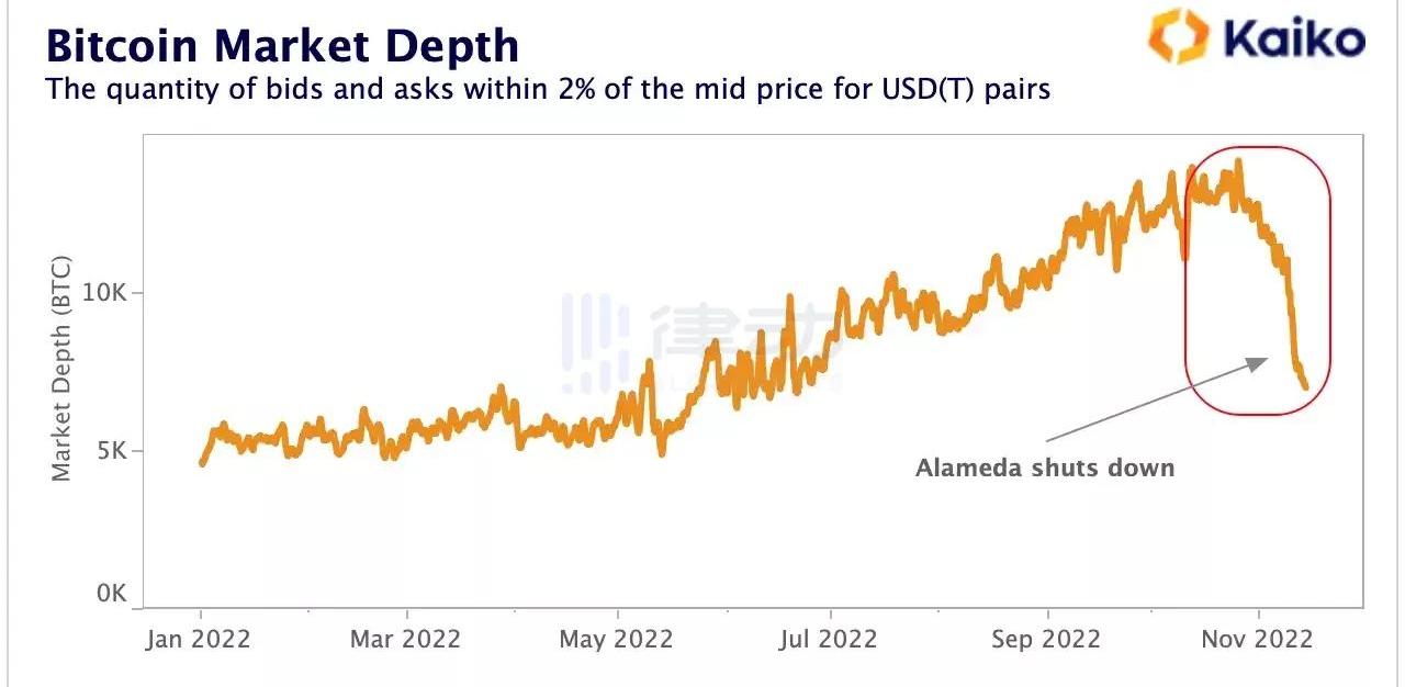 由于加密市场的大部分流动性都是由Alameda、Wintermute、AmberGroup、Genesis等几家大型做市商主导的,随着作为最大的做市商之一的Alameda宣布停止交易,市场流动性骤降。更严重的是,跟随FTX暴雷事件的推进,AmberGroup、Wintermute和Genesis也均已宣布他们的资金被困在FTX上。大厦将倾,散户们也为了规避风险恐慌出逃,这多方面原因的叠加更进一步地加剧了市场流动性紧缩危机,