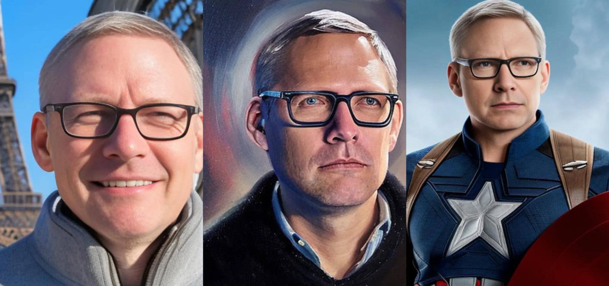 特别有趣的是如何扩展这些模型以生成新的或特定领域的图像,而几乎没有创造性的干预。例如,Guido采用了预训练图像模型,并在他自己的几十张照片上对其进行了重新训练。从那里,他能够在提示中使用<guido>生成图片。以下是根据以下提示生成的照片:“<guido>美国队长”、“<guido>在巴黎”、“<guido>在油画中”。