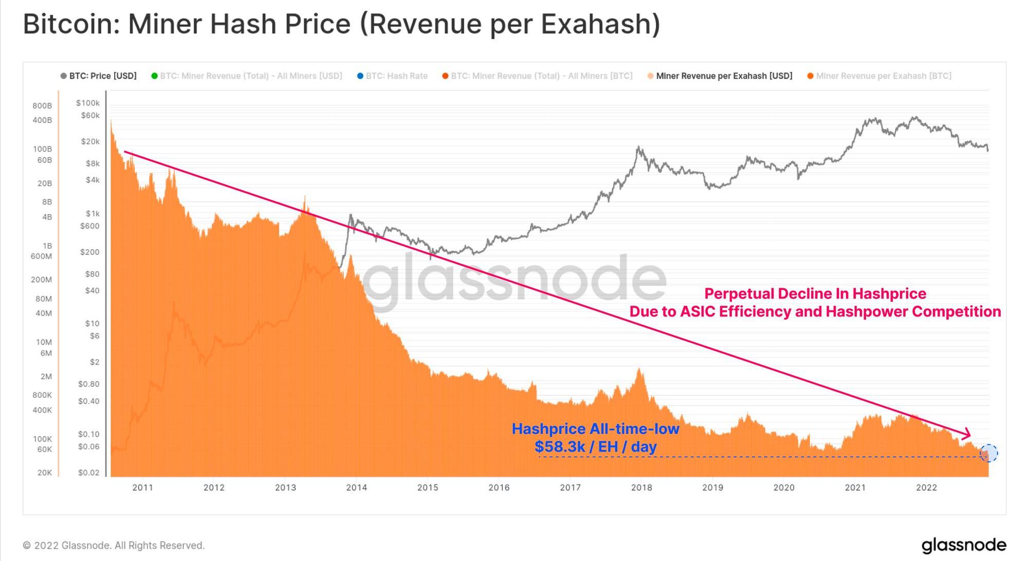 比特币矿工哈希价格已跌至每天5.83万美元/EH的历史新低,接近许多矿机的关机价格。