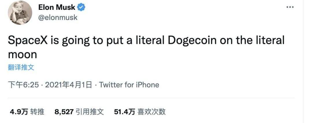 第七次:马斯克的推文2021年4月1日愚人节,马斯克表示,要用SpaceX把一枚狗狗币带到月球上。