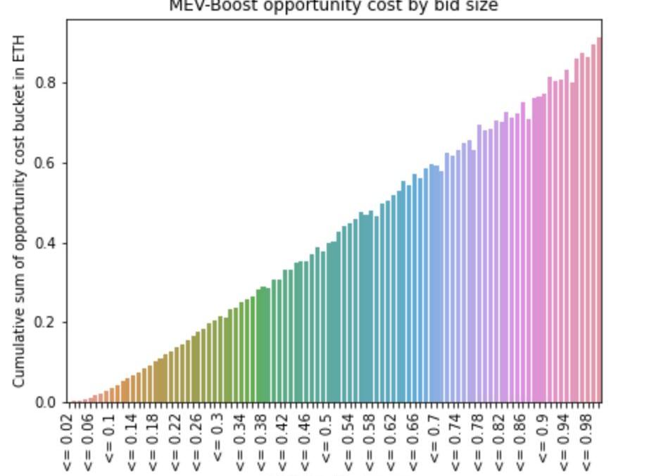 设置最低出价的机会成本是使用Flashbotsmev-boost中继的区块与本地构建的区块之间的区块利润的累积差异。最低出价越大,本地建造的区块就越多,机会成本就越大: