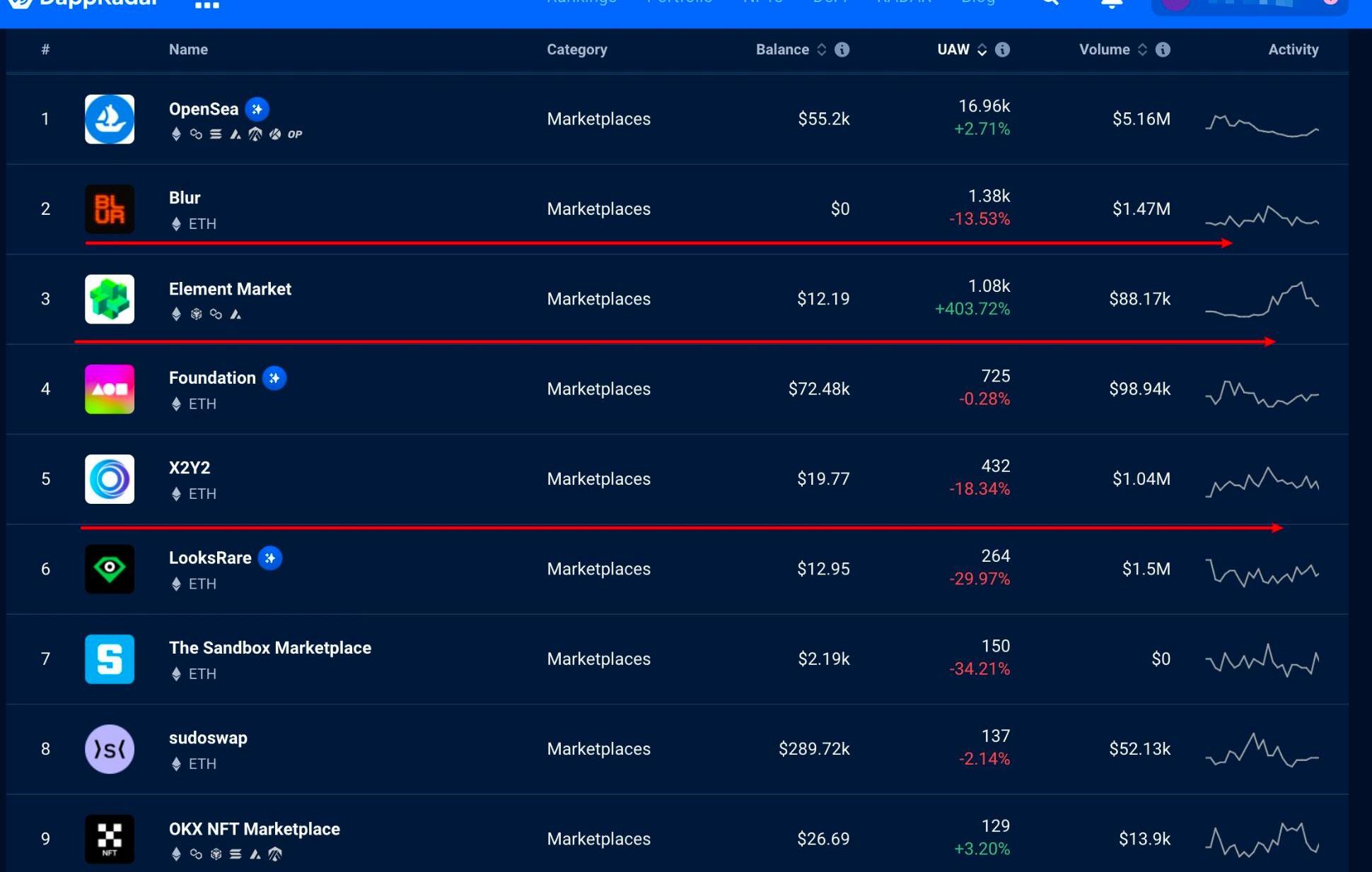 因为有很多NFT项目屏蔽了Blur和X2Y2,导致Blur的日活从4000左右下降到了1300左右,X2Y2的日活从2000左右下降到了600左右,Element由于未在屏蔽当中,受益于0.5%的手续费和全网最低的gas费,日活反倒是涨了4倍,来到了1000左右的日活。