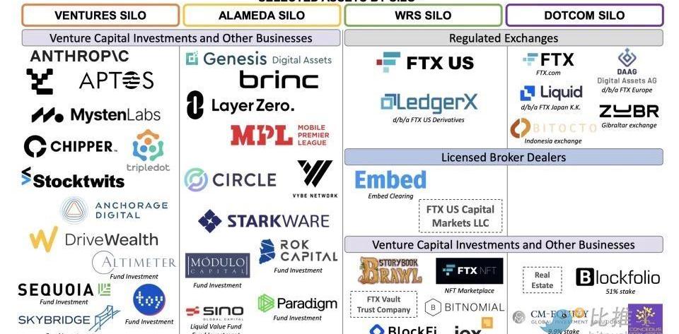 WRS筒仓,控制并包含美国的资产。Alameda筒仓,其中包括现已解散的对冲基金AlamedaResearch。风险投资筒仓,投资于加密公司和初创公司。Dotcom筒仓,其中包括国际业务,FTX的大部分存款。