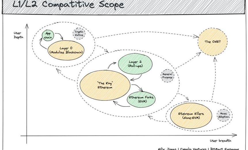 除了王者Ehtereum外,L1/L2可以根据功能和操作语言的角度分为4类:Ethereum杀手、Ethereum分叉、第0层和第2层。