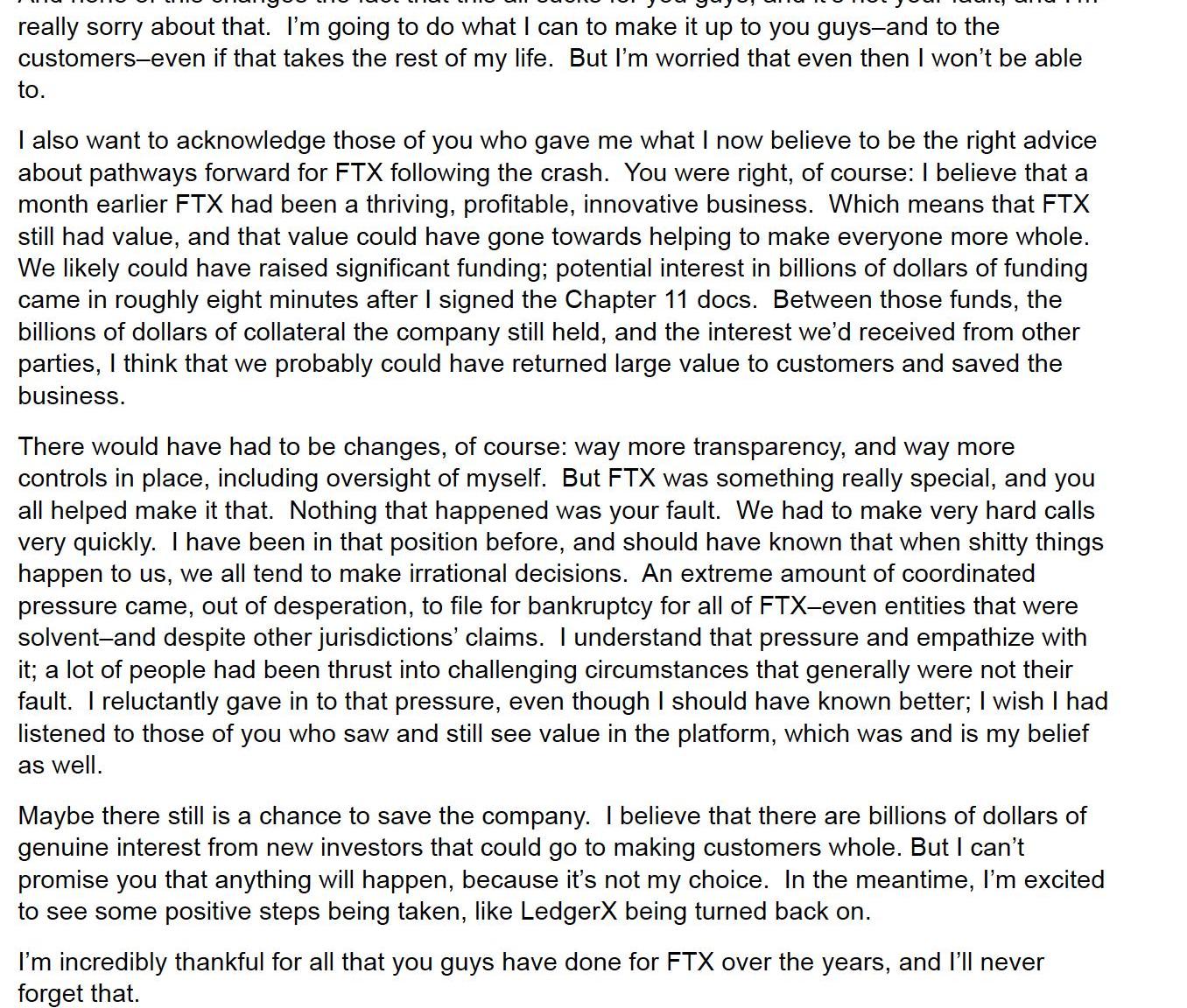 “面对压力和泄密以及Binance,我愣住了,什么也没说,”他说。Bankman-Fried于11月11日卸任FTX首席执行官,就在他的公司申请破产之前。他不是公司的现任员工,新任首席执行官约翰雷三世在Bankman-Fried发了多条推文并向记者介绍了公司后表示。周二致FTX员工的信是由一名现任员工发布的,因为Bankman-Fried不再有权访问公司Slack。根据Bankman-Fried的说法,FTX今年春天有大约600亿美元的抵押品和20亿美元的负债,但市场崩盘意味着抵押品的价值减半。该行业信贷的“枯竭”进一步意味着FTX的抵押品价值约为250亿美元,尽管他的负债衡量值跃升至80亿美元。11月的另一次崩盘“导致抵押品价值在很短的时间内再次减少约50%”,他当时对抵押品的估值为170亿美元。他说,银行挤兑是由Bankman-Fried在11月份称之为“攻击”造成的,又减少了80亿美元的抵押品。“当我们疯狂地把所有东西放在一起时,很明显这个头寸比它在管理员/用户上显示的要大,因为在FTX拥有银行账户之前有旧的法定存款,”他说。“我没有意识到保证金头寸的全部范围,也没有意识到超相关崩盘所带来的风险程度。”