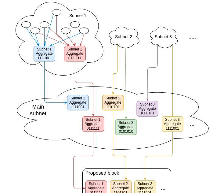 个验证者。首先,每个委员会中的验证者在该委员会专用的p2p子网中广播他们的签名。每个委员会中有16个指定的聚合者,每个聚合者将看到的所有签名合并为一个聚合签名。指定的聚合者将其聚合签名发布到主子网中。