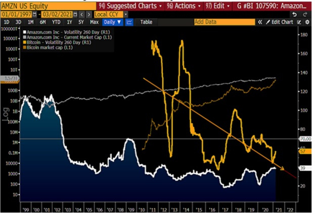 Amazon.com? 和比特币——互联网兄弟。Bloomberg Intelligence 认为,认为,如果传统评估模式延续的话,几年内比特币的年度波动性将好于 Amazon.com 公司股价。按照分析,比特币 260 天风险度量值大约为 60%,而使用互联网衡量世界上主要的商品卖方的相同度量值则为40%。到2022年,比特币的波动性回归线有望好过 Amazon.com? 公司。要知道,在 Amazon.com? 公司公开交易的最初几年中,其波动性平均超过 100%。