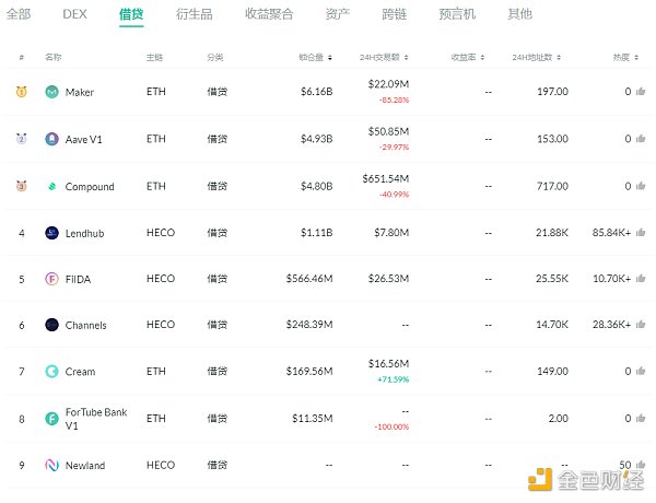 锁仓量排名前十的借贷平台 排名来源:DeFibox
