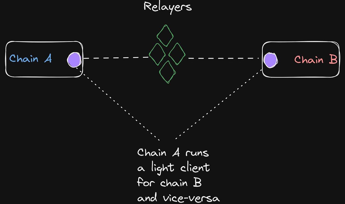 然后,这两条链需要对方链上的一个轻客户端来加密验证两条链之间的共识状态,还需要一个中继器在两条链上的轻客户端之间传递信息。中继器是有效性所必须的——能够在节点之间交换信息,节点成功达成共识的能力。让我们来探讨一下这在实践中是怎样的。