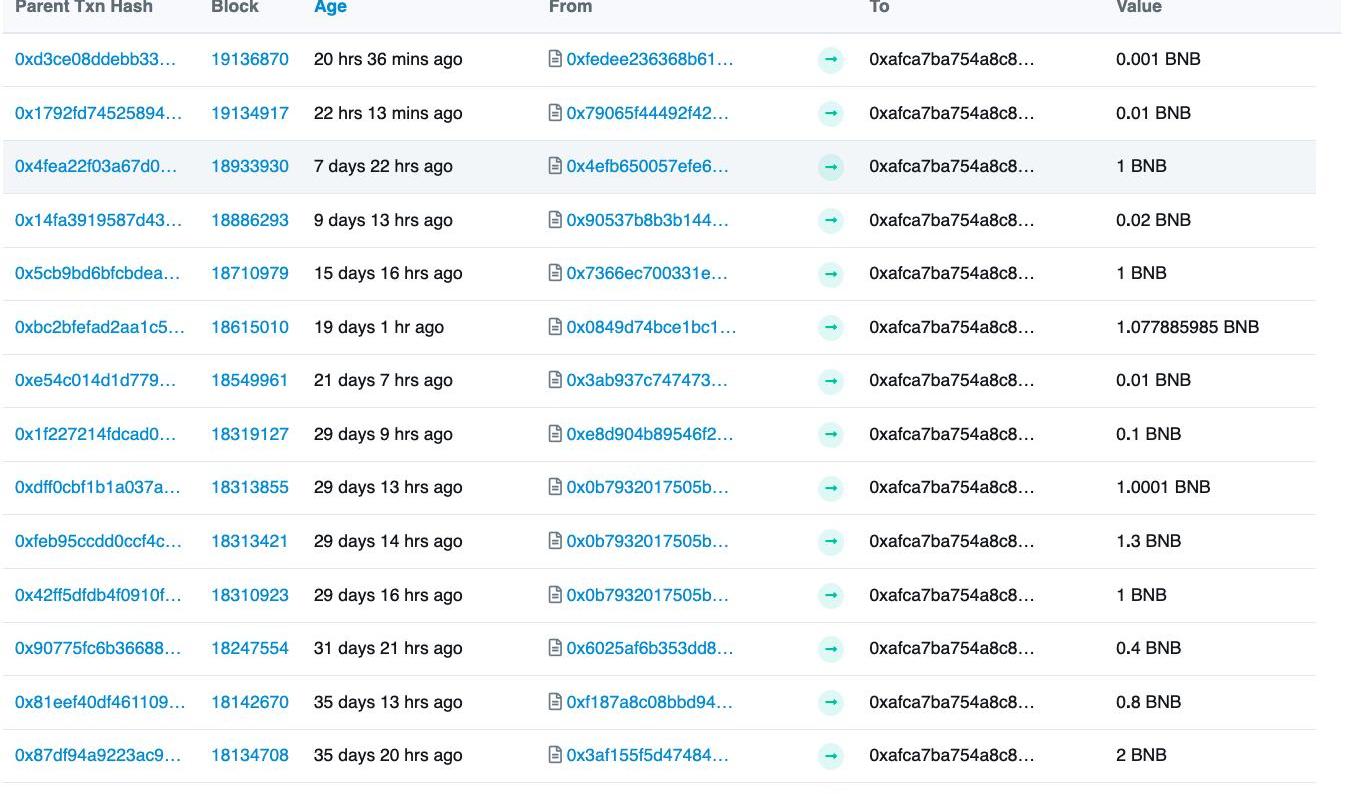 我们去浏览器上查看,发现这个地址比较新,只获利了0.01BNB。