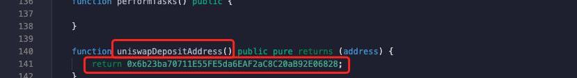 这里调用了*manager.uniswapDepositAddress(),*本身代码也不在本合约中,看名字又极具迷惑性,很容易让人以为是调用了uniswap的某个官方函数而掉以轻心。但我们根据本合约引用的代码进行追踪,发现存在于这个地址: