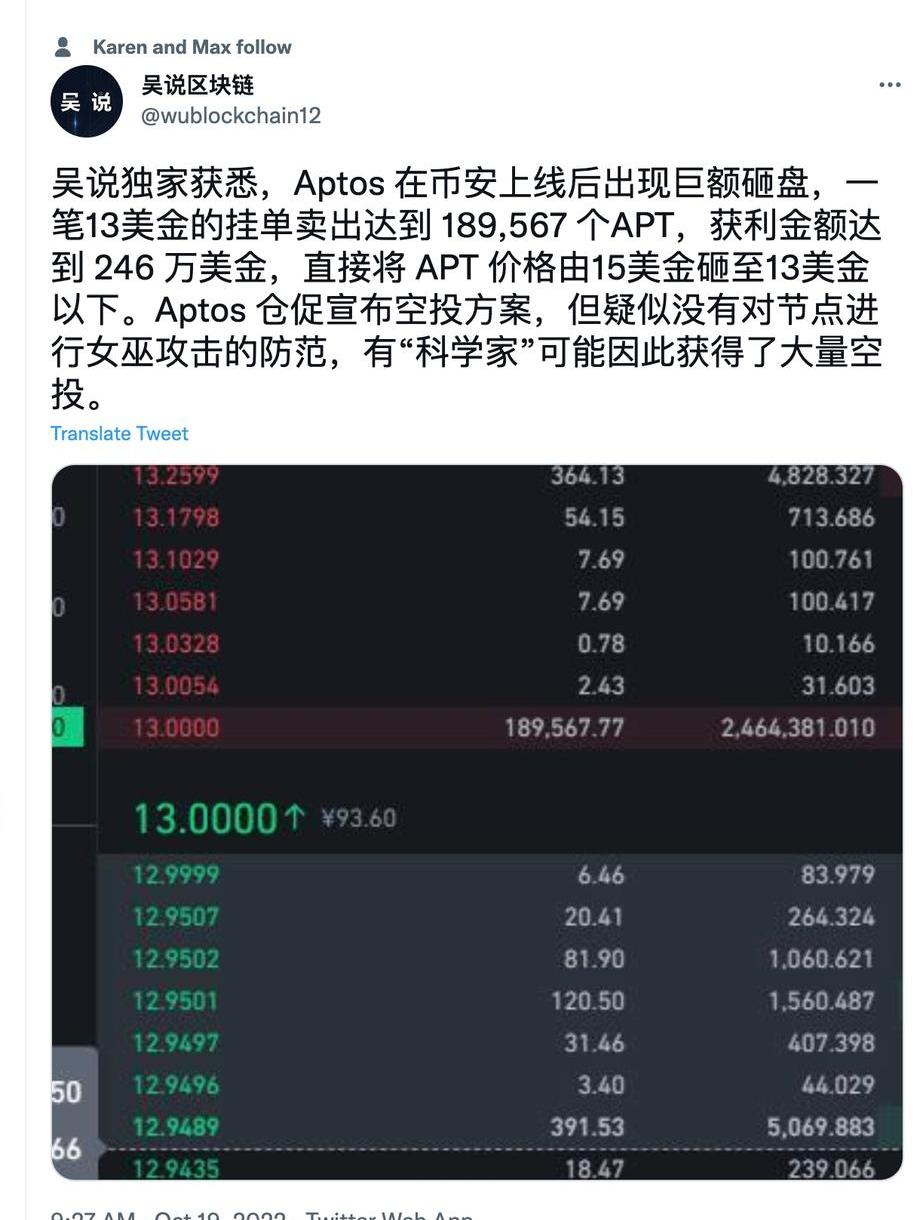 据吴某说,Aptos时间段上线出现巨额砸盘后以13月18日上午18点,18点,5567个APT的卖单项目时,有人或女方攻击者砸盘砸盘,我们进行了深入分析。
