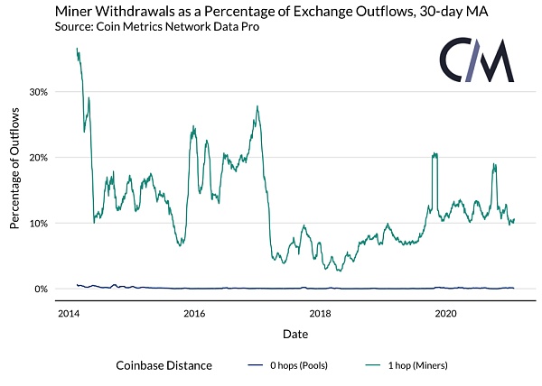 Coin Metrics的矿工流通过将集群基于地址与币基交易的跳数距离来说明这种架构。已收到币基奖励的地址,或0跳地址,被假定属于矿池。从0跳地址收到过付款的1跳地址被标记为属于矿工。这种分析方式比共同输入-所有权分析方式更不精确,但大致反映了矿池钱包的结构,并提供了更好的覆盖面。