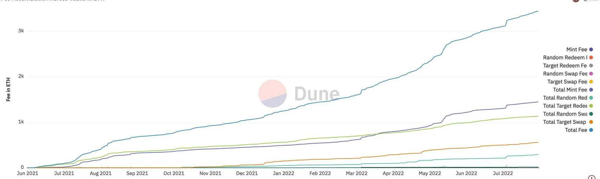 风险:用户不一定能拿回质押后的NFT,所以不要质押rareNFT或者有特殊意义的NFT。c.观点:NFTX主攻在地板价附近的NFT(因为他们在产品设计的时候观察到用户一般会为地板价附近的NFT创建vaults。NFTX在v1版本的时候还支持集合法(combinedfund),但是他们指出由于底层资产同样需要流动性导致流动性不够集中,现在这个功能还存在,但是?用户并不怎么建立combinedfundvault。相比NFT20,NFTX有NFTstaking的应用场景,可选择liquidity或者inventorystaking。绿线代表指定赎回的费用,和铸造费用在前期基本重合,代表着用户对指定赎回的需求。