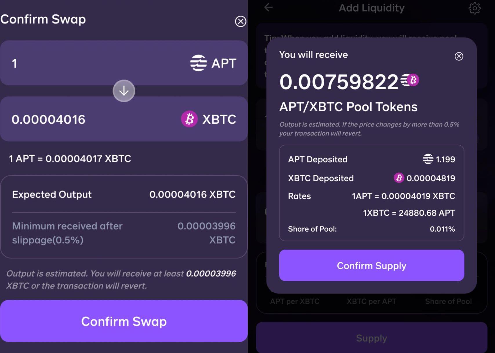 目前,已和DEX项目Enchanter达成合作,用户已经可以在Aptos的Devnet上交易$xBTC,并通过提供xBTC-APT的流动性对得到手续费收益。