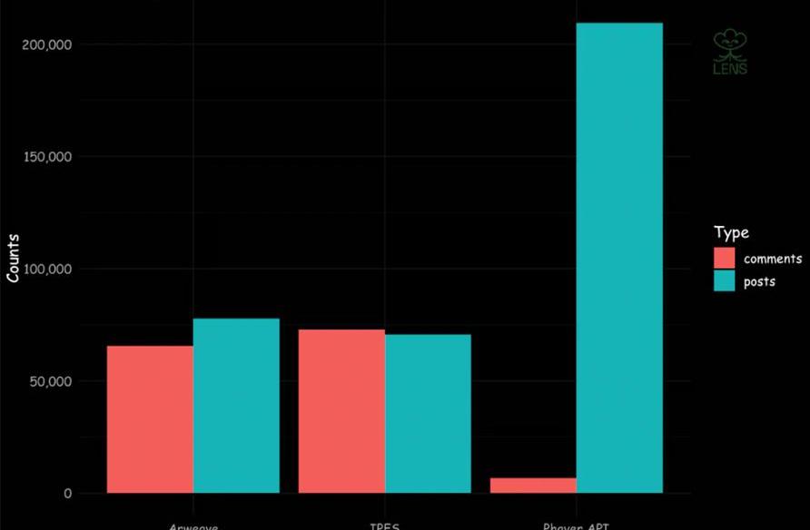 金融是用户发帖的首要话题,法律与政府、新闻和金融在负面情绪方面表现突出。相比之下,在线社区、体育、艺术和娱乐以及游戏显示出更多的积极情绪。