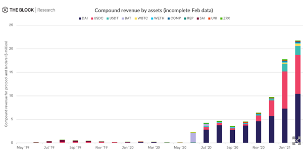 The Block对去中心化金融市场上的头部协议收入状况进行了分析,总体而言,许多DeFi协议都成功获得了可观收入。不过,虽然DeFi行业出现了流动性挖矿等一系列新举措,但大部分收入仍然流向协议供应方(尽管这一趋势目前已经所有改变)。另外值得注意的是,除了Balancer之外,所有DeFi协议在2021年的前两个月都创下月度收入记录。