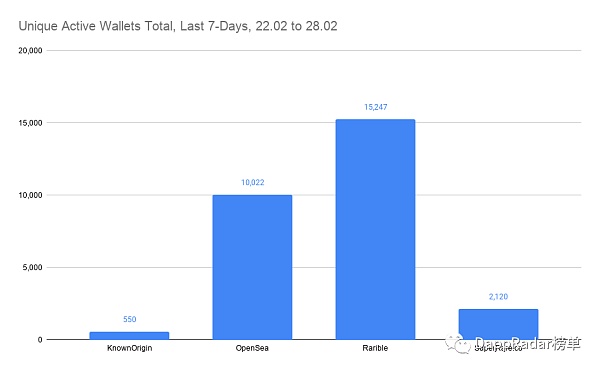通过观察7天内与顶级市场dapp交互的独立的活跃钱包状况,可以发现Rarible在用户活跃方面领先于OpenSea,7天内用户活跃超过1.5万UAW,而OpenSea只有1万。有趣的是,2月24日,OpenSea宣布他们将推出独家的NFT活动,这导致用户数出现暂时激增,但仍不足以超过Rarible。