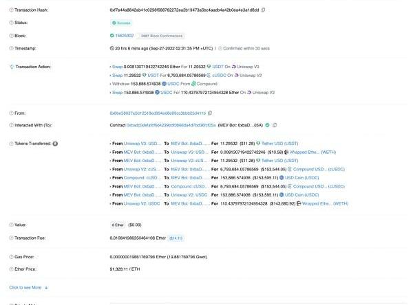 在MEV机器人被利用之前,它已经预先运行了一笔交易,该交易从仅仅11美元的USDT中获利了15万美元。该交易是一个180万美元的系列兑换,从cUSD兑换成WETH再到USDC。由于交易过程中的价格下跌,180万美元的SWAP只换来了约500美元的USDC。