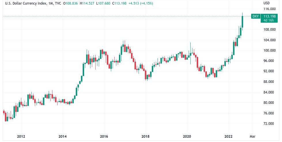 美元指数(DXY)1个月蜡烛图来源:TradingView