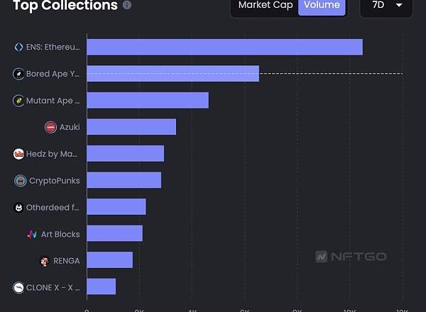 本周市场交易量排名前三的NFT分别为ENS、BAYC、MAYC。