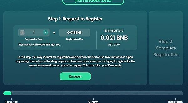 目前注册一年是0.021BNB,差不多5.767美元;注册2年是0.038BNB,3年是0.058,注册时间越长,费用相对越高,但整体是在相对较低的费用。