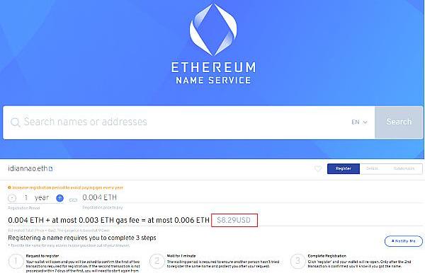 当前注册一个5位数域名是8.29美元,注册后可绑定以太坊钱包地址。