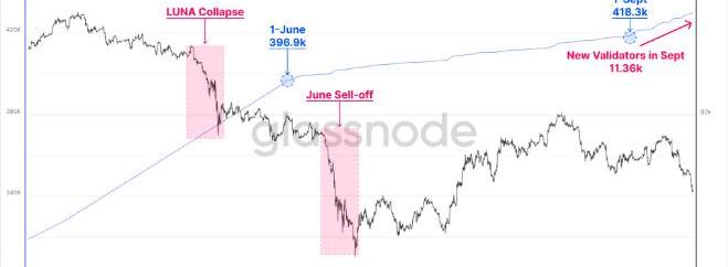 正如上图中看到的,活跃的以太坊验证者在6月1日至9月1日之间没有看到太多的增长。在这几个月的停滞增长中,该指标仅增长了约22k。然而,这种情况在9月初发生了迅速变化。