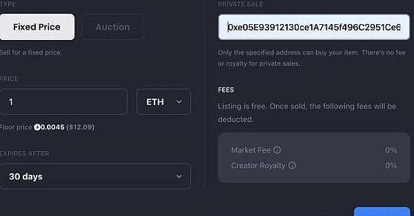一些NFT交易市场提供支持NFT私人销售的功能。这是一种只有特定地址才能购买列出的NFT的销售类型。这就像场外交易销售,由于发生在市场平台上,具有额外的安全性。