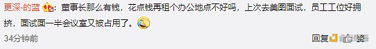 还有网友发问,“买几个比特币就算进军区块链了?”有网友称:“比特币为代表的虚拟货币是有史以来最纯粹的泡沫”,另有网友调侃到:“董事长那么有钱,花点钱再租个办公地点不好吗,上次去美图面试,员工工位好拥挤,面试一半会议室又被占用了。”