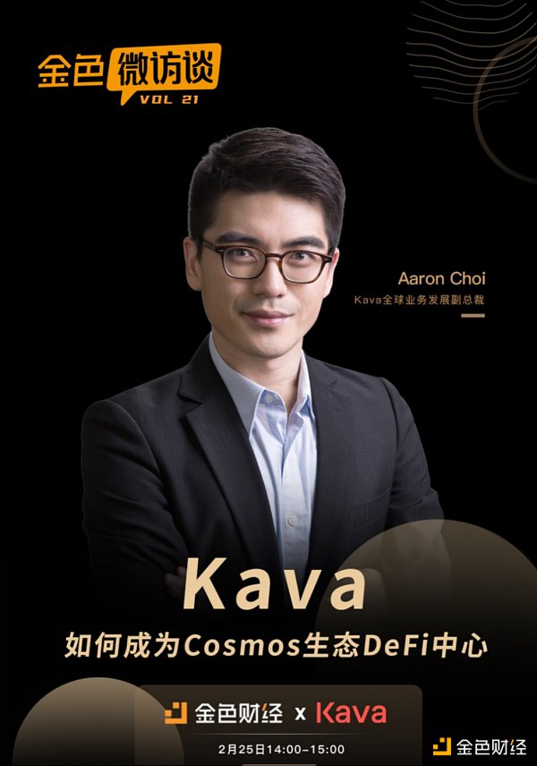 2月25号14:00,Kava全球业务发展副总裁Aaron Choi做客金色微访谈直播间,本次直播由金色财经海带主持,主题为“Kava如何成为Cosmos生态DeFi中心?”。