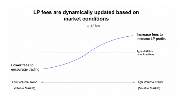 通过在代币价格剧烈波动时提高交易费用,DMM 可以帮助流动性提供者抵消 “无常损失”,使其赚取更多费用,从而降低无常损失的影响。反之,在价格波动性较低时,DMM 会动态降低价格,从而鼓励用户提高交易量。