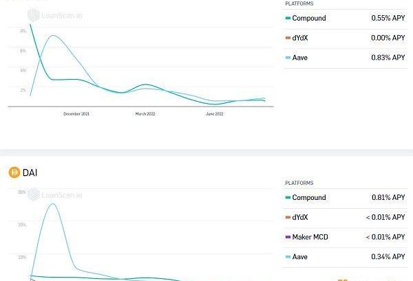 此外,市场的冷却也表现在收益率上。基于稳定币USDC、Dai的借贷APY在过去一年经历下降。基于ETH的借贷APY可能因为合并事件的影响而有所上升。